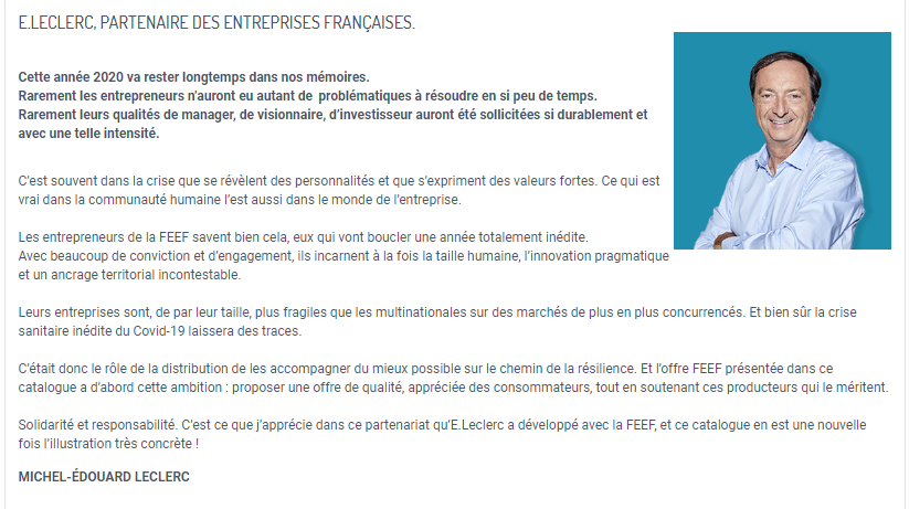 Pour soutenir une consommation porteuse de valeurs, E.Leclerc propose une sélection de produits issus de PME françaises membres de la Fédération des Entreprises et Entrepreneurs de France (FEEF).