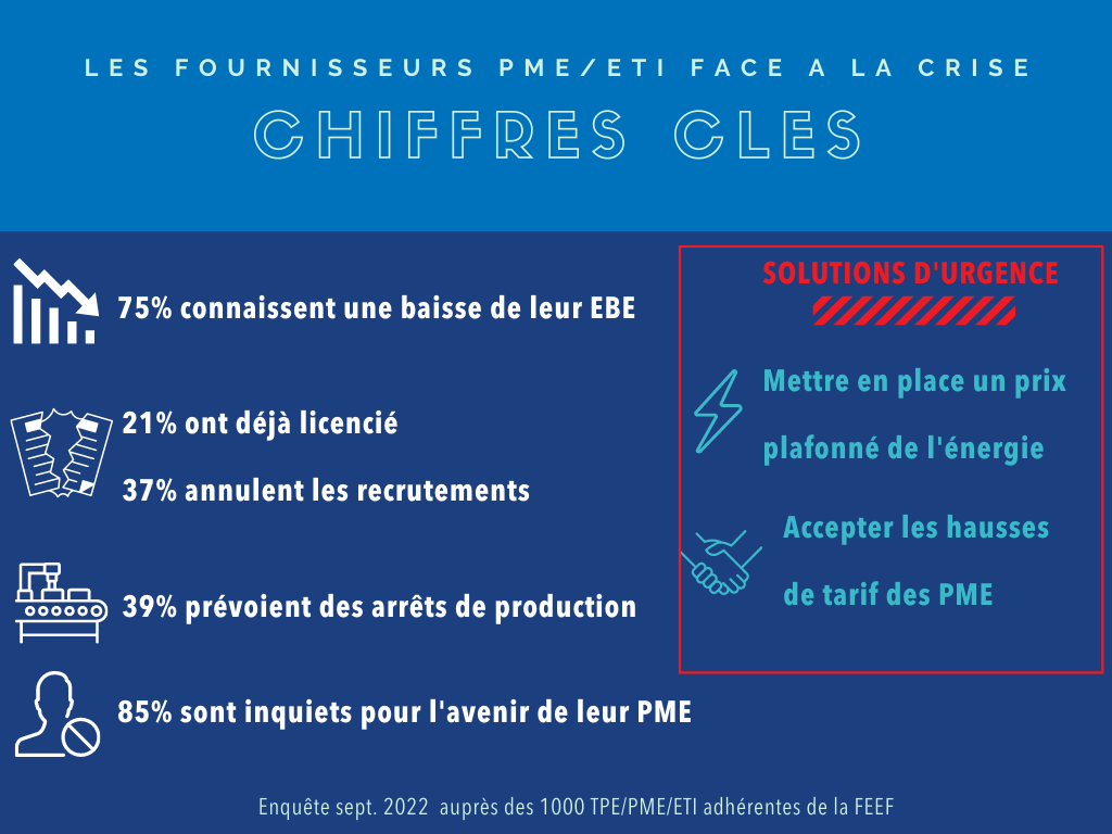 Léonard Prunier, Président de la FEEF, propose un pacte de confiance pour les PME : « Prises en étau entre une hausse généralisée de leurs coûts et la difficulté de répercuter ces augmentations de prix, les PME voient leur équilibre économique mis en péril. Sans politique volontariste, ces différents signaux négatifs vont se traduire dans les prochains mois par des décrochages et des faillites. La pérennité de notre maillage industriel dans les territoires est aujourd’hui clairement en jeu ».