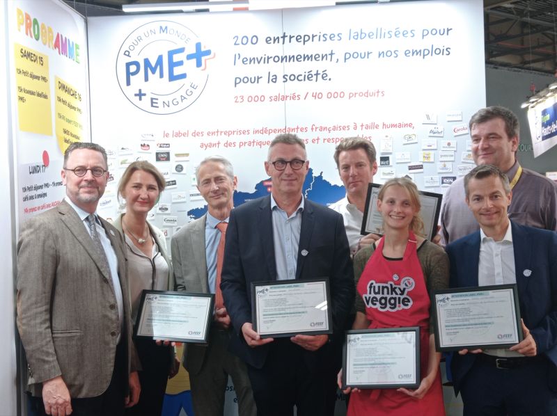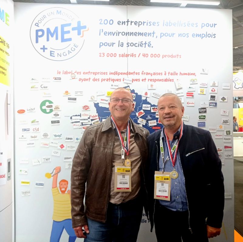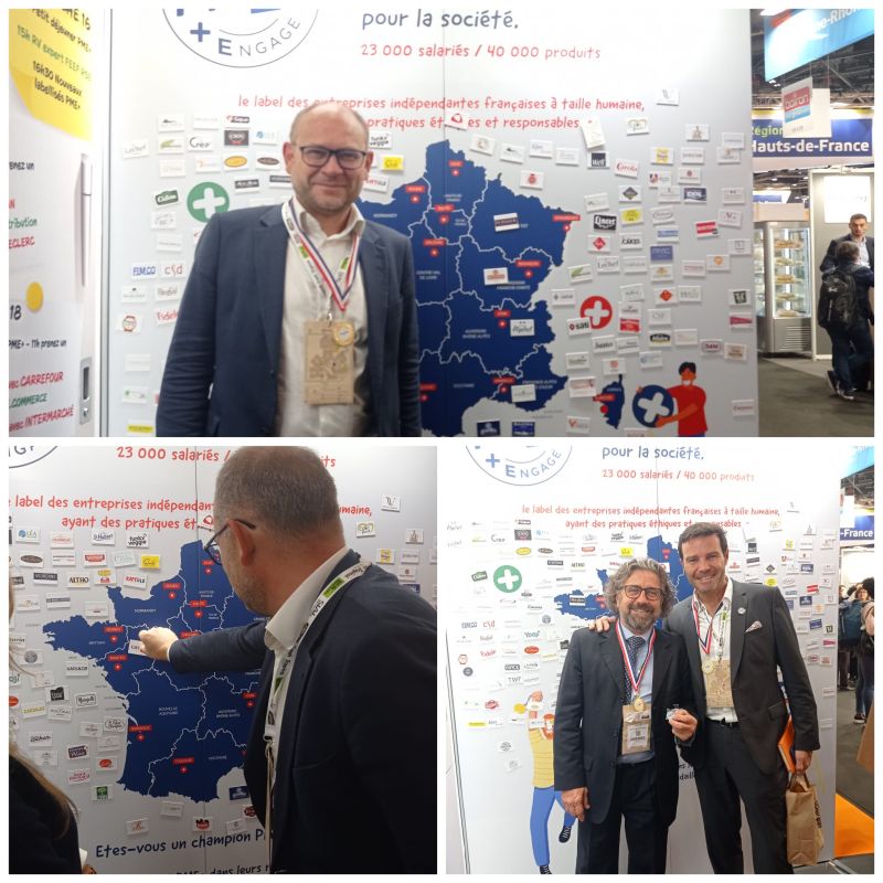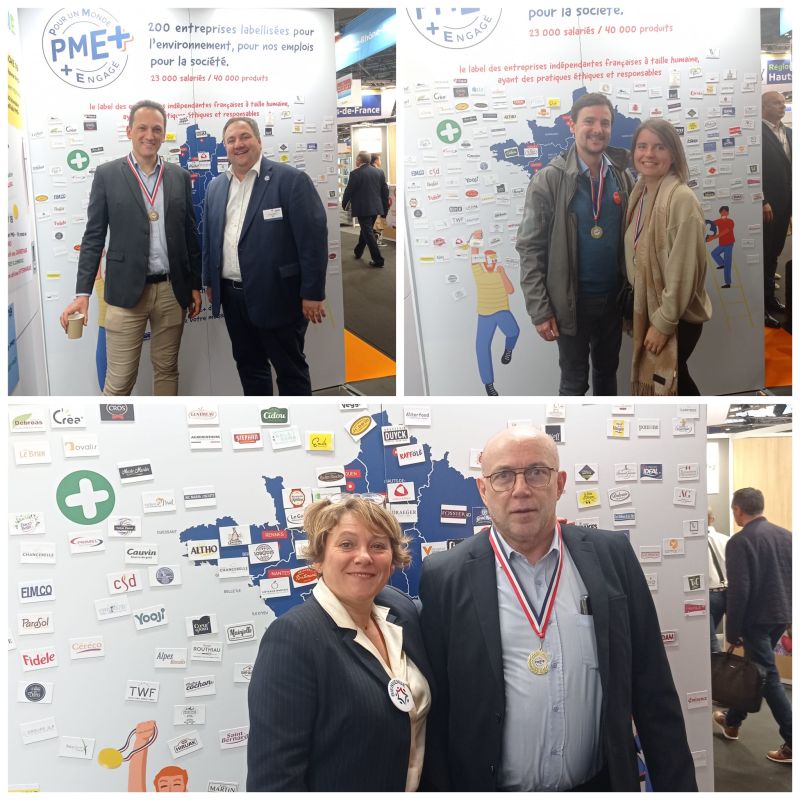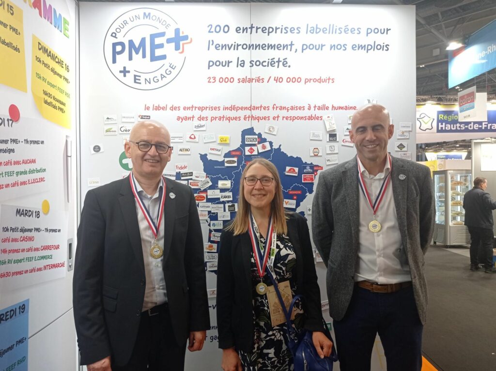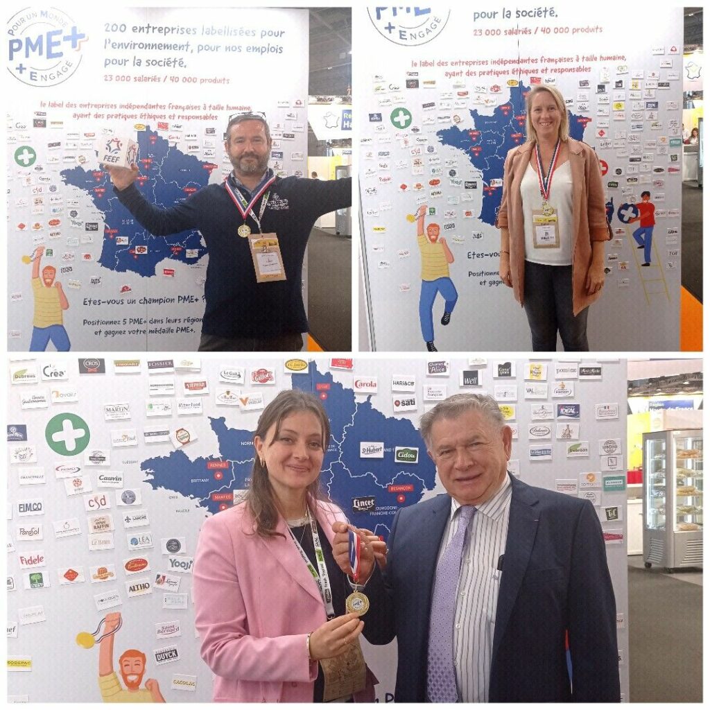Toutes nos félicitations également à Salaisons Cros pour sa labellisation PME+ représentée par Yoann Cros, dirigeant, accompagné de Jean-Pierre LANDREAU, Directeur commercial. Une PME+ engagée pour un approvisionnement responsable avec des jambons et viandes 100% françaises. Labellisation remise par Christine Barthe, Déléguée générale de la FEEF.