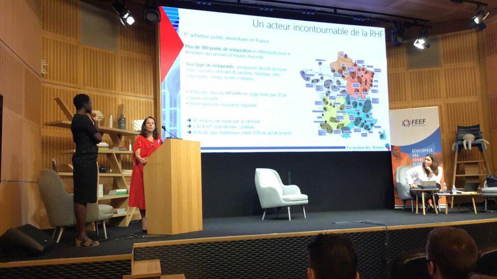 Stéphanie LE COUR GRANDMAISON, Cheffe de Division Technique et Déborah FAYE de l’ECONOMAT DES ARMEES ont rappelé que l’EDA est le 1er acheteur public avec 300 points de restauration et 40 millions de repas. Elles ont précisé leur organisation logistique et achat et rappelé les principes de la commande publique.